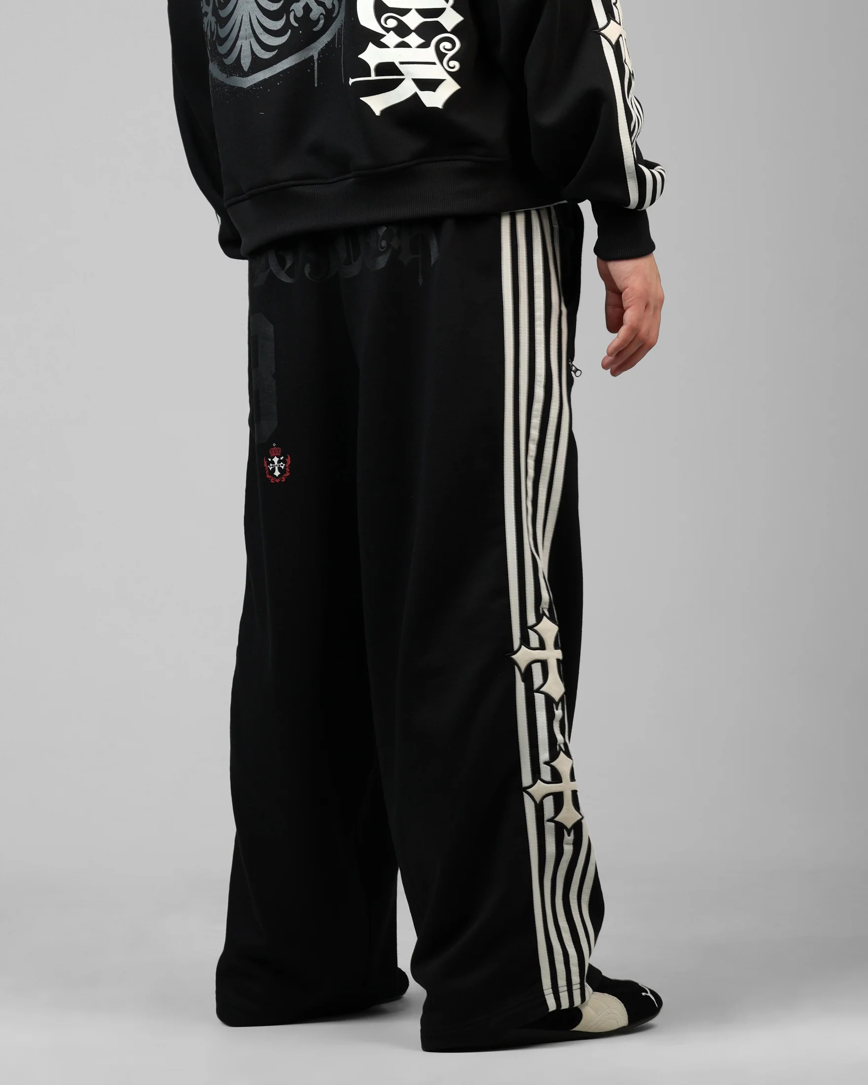 Luxe meets streetwear in these epic sweatpants by Loiter. Featuring printed graphics that give you all the style while the elasticated waist makes sure you get the perfect fit. Designed with your comfort in mind, this pair is sure to be the trusty addition to your wardrobe. Cop yours today at Culture Kings. - Printed graphics - Elasticated waist - Twin needle stitching - Zipper details - Dual side pockets - Dual back pockets - Baggy fit - Color: Black - Style: LTQ425150